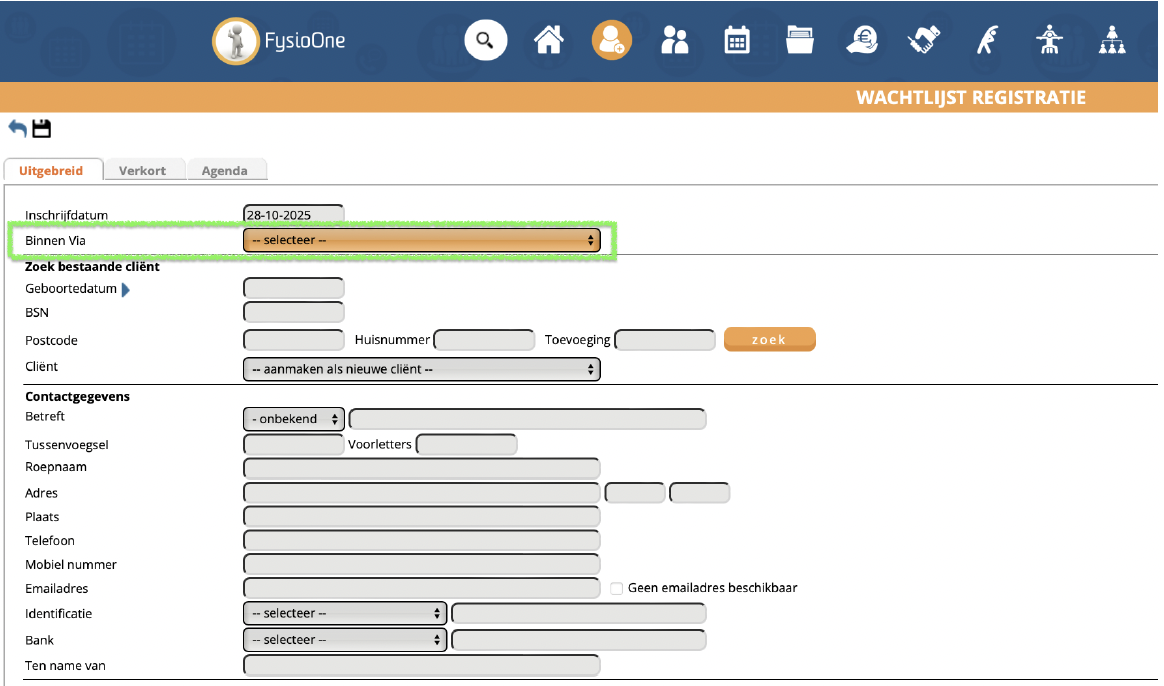 Configuratie (blauwe balk) → Algemeen → Omgevingsinstellingen → Instellingen m.b.t. wachtlijst, agenda en declareren → ‘Binnen Via’ verplichten in de wachtlijst