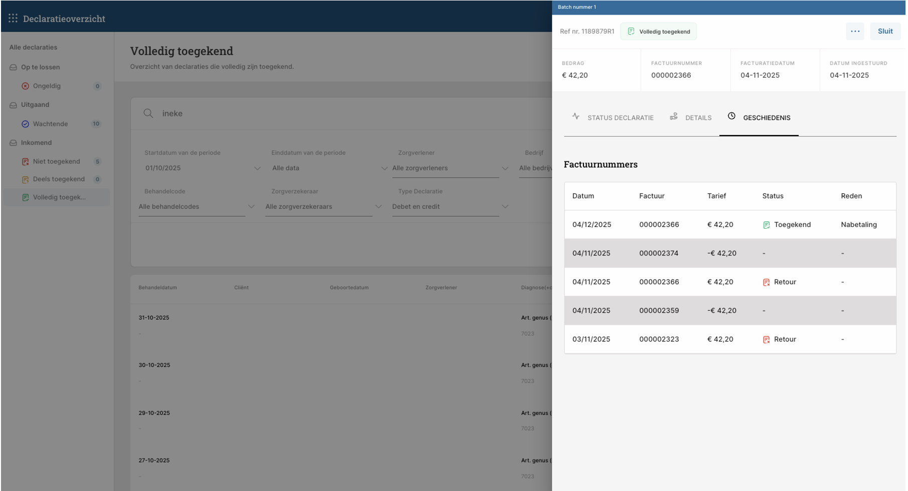 Begin 2026 zal het ook mogelijk zijn om declaraties die bij ‘Wachtende’ staan na 30 dagen te markeren als ‘Volledig toegekend’ of ‘Niet toegekend’. Hiermee kan retourinformatie die wel bij de verzekeraar beschikbaar is, maar niet in ons systeem kon worden verwerkt* alsnog worden doorgevoerd.