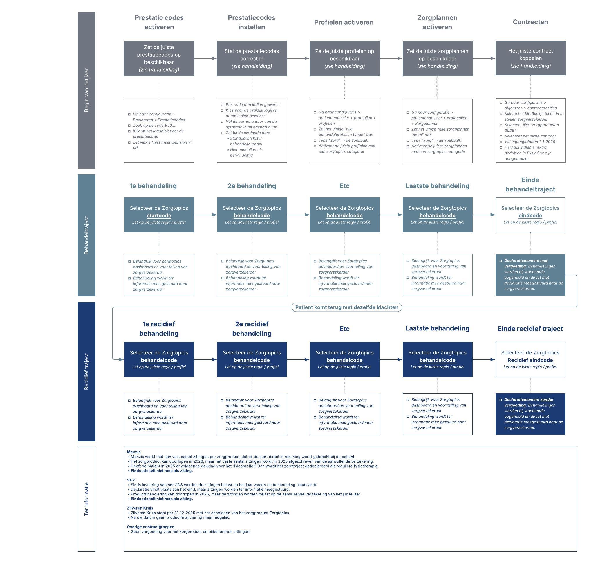 Om ervoor te zorgen dat de data correct wordt geëxporteerd naar Zorgtopics en u de juiste inzichten krijgt in het Zorgtopics Dashboard, gebruiken we een startcode. Deze startcode heeft dezelfde declaratie onder code als een tussenliggende behandeling, maar maakt het mogelijk de start van het traject te onderscheiden van de behandelcode. Op die manier krijgt u beter inzicht in het verloop van het Zorgtopics-traject.