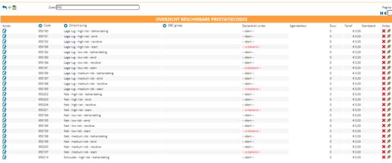 We hebben de prestatiecodes alvast voor u klaargezet in HCI SpotOnMedics. U vindt deze eenvoudig door te gaan naar Configuratie > Declareren > Prestatiecodes en in de zoekbalk te zoeken op “950”.