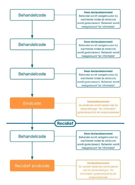 Let op: Er kan meerdere keren sprake zijn van een recidief. Dit gebeurt wanneer een patiënt herhaaldelijk klachtenvrij is verklaard (en het behandeltraject wordt afgesloten), maar binnen de garantieperiode toch weer terugkeert met dezelfde klachten. Iedere keer dat dit gebeurt, wordt de recidief-procedure opnieuw toegepast, volgens onderstaande flow. Dus met een nieuwe behandelcodes en een nieuwe eindcode