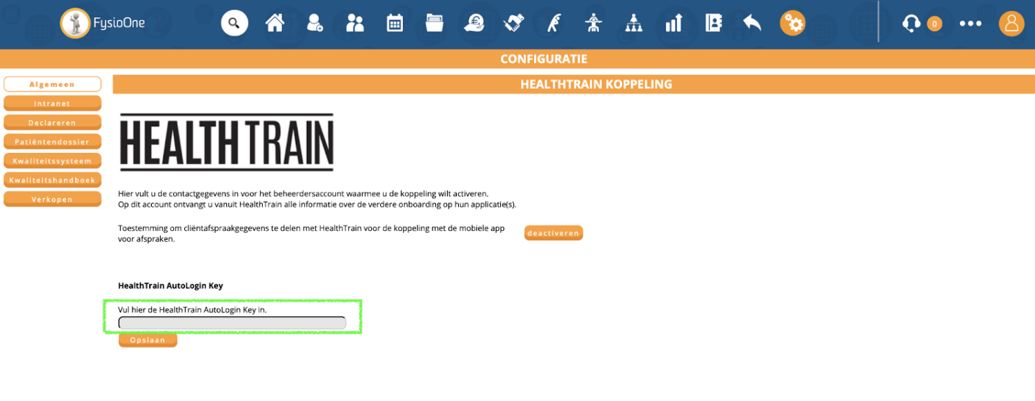 De praktijkhouder voert de AutoLogin Key in via de configuratiepagina:  Configuratie (blauwe balk) → Algemeen → Webservices & SSO → HealthTrain