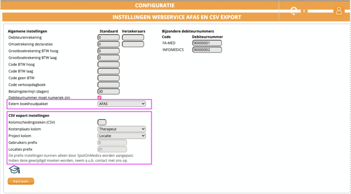 Controleer de instellingen bij Configuratie > Algemeen > Instellingen AFAS, Exact Online en Twinfield.