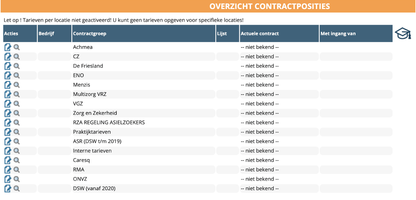 Als u navigeert naar configuratie > algemeen > contractposities dan komt u bij onderstaande pagina. Wanneer u op het kladblok icoon klikt dan navigeert u naar de pagina om de contractposities in te stellen. Wanneer u op het vergrootglas icoon klikt dan gaat u direct naar de contracttarieven van de specifieke contractgroep.