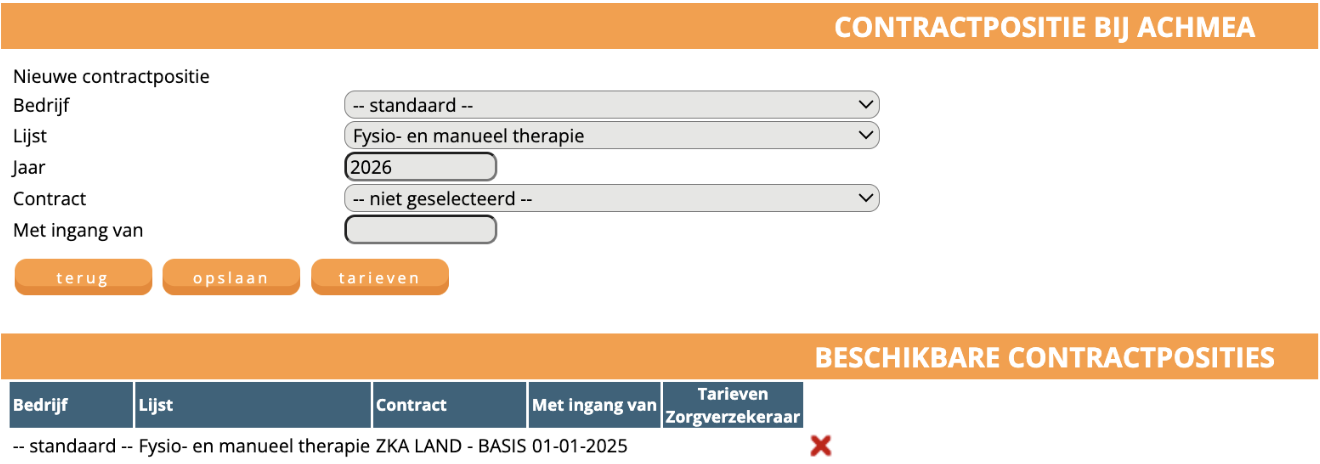 Wanneer u op het kladblok icoon klikt dan komt u op onderstaande pagina. Selecteer hier het bedrijf > selecteer de lijst > zet het jaar op 2026 > selecteer het contract > bepaal de ingangsdatum. Wanneer u op “opslaan” klikt dan heeft u de contractpositie ingesteld. Daarnaast kunt u vanuit deze pagina ook direct navigeren naar de declaratie tarieven door op de knop “tarieven” te klikken.