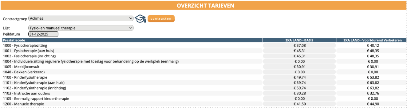 Ga naar configuratie > algemeen > declaratietarieven > selecteerde contractgroep > selecteer de lijst > selecteer de peildatum (vb 1-1-2026). Vanuit het overzicht kunt u ook direct navigeren naar de contractposities door op de knop “contracten” te klikken. Hij navigeert in dit geval naar de geselecteerde contractgroep. De opgegeven lijst wordt niet meegenomen naar het overzicht van contractposities. Deze kunt u weer opnieuw selecteren indien gewenst.